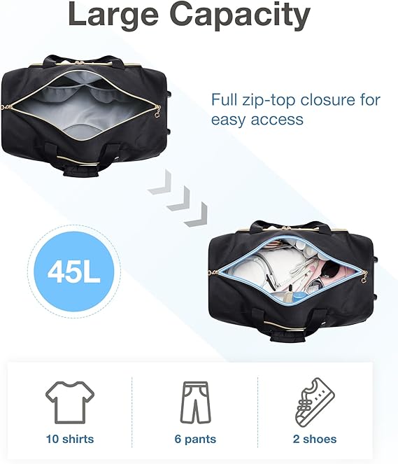 - Roomy Capacity: With 45L spacious internal space and multi-pockets, it was very deep, roomy, spacey. This travel duffel bag adopts Large top opening, which is convenient for quickly getting items. It made it easy to stay organized. It is also equipped with 1 wet pocket+2 mesh slip pockets+2 front pockets for storing daily necessity. It can be used for short trips of at least 2-3 days