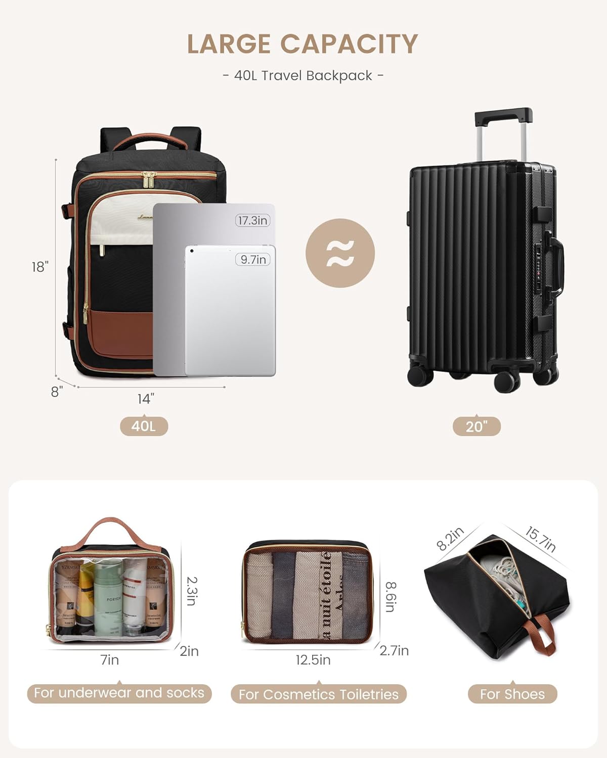 - Travel Backpack Carry on Flight Approved: Precisely designed at 14"x8"x18" (40L) and 14"x8"x19.5" (50L) to meet the strict requirements of airlines like Spirit and JetBlue. Fits seamlessly overhead or under the seat, guaranteeing you avoid extra fees. The perfect choice among travel bags for women.