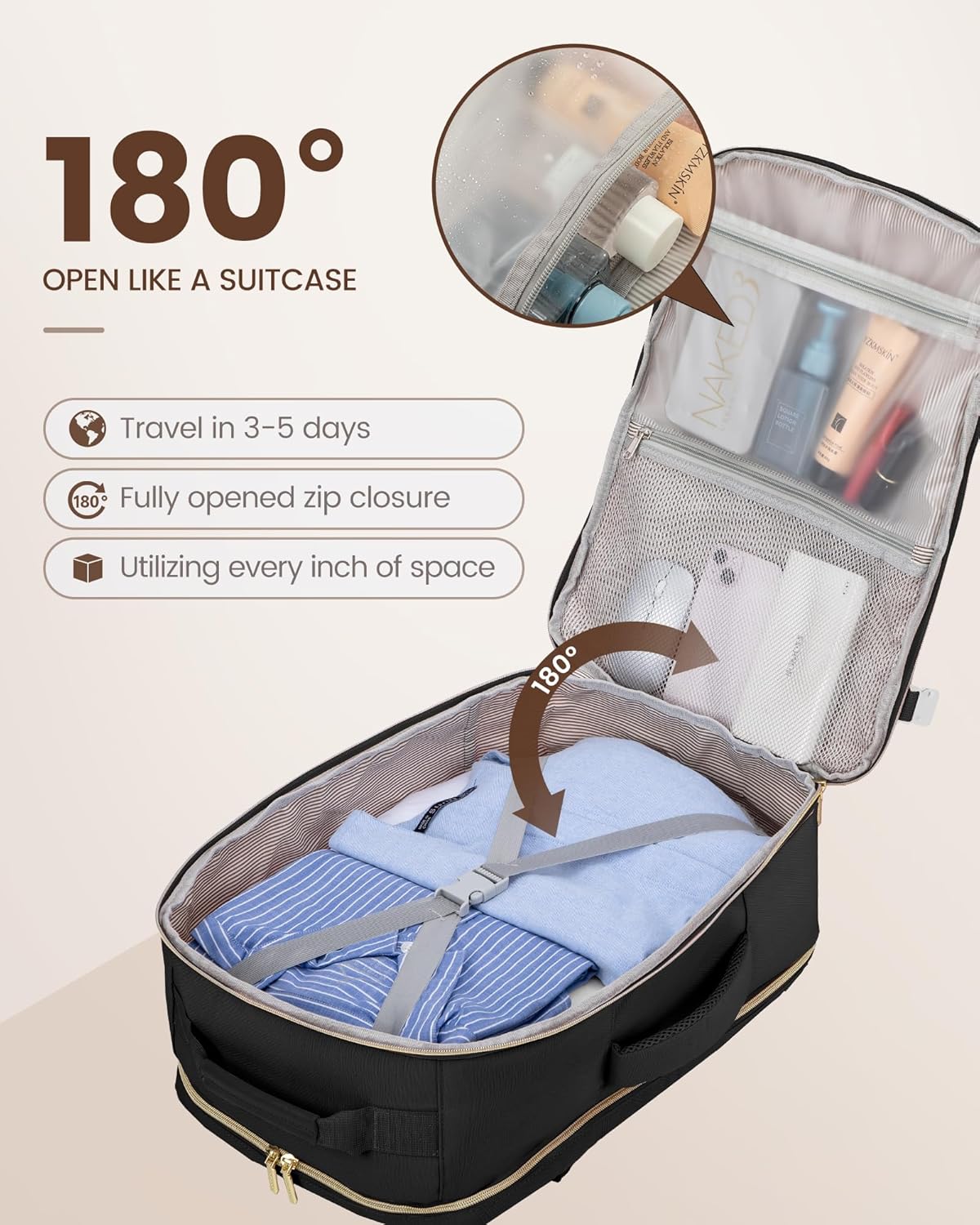 - ✈【As Personal Item Airline Approved】: The size of the carry on backpack is 18*14*8inch. Meets the maximum size allowed by most International Air Transport Association (IATA) flights, and can be placed in the overhead luggage compartment and under seat luggage for airlines, suitable for Spirit, Frontier, Easy Jet, Jet Blue, and other airlines. This travel backpack for women airline approved can be freely opened 90-180 degrees easily and quickly at the airport security check.