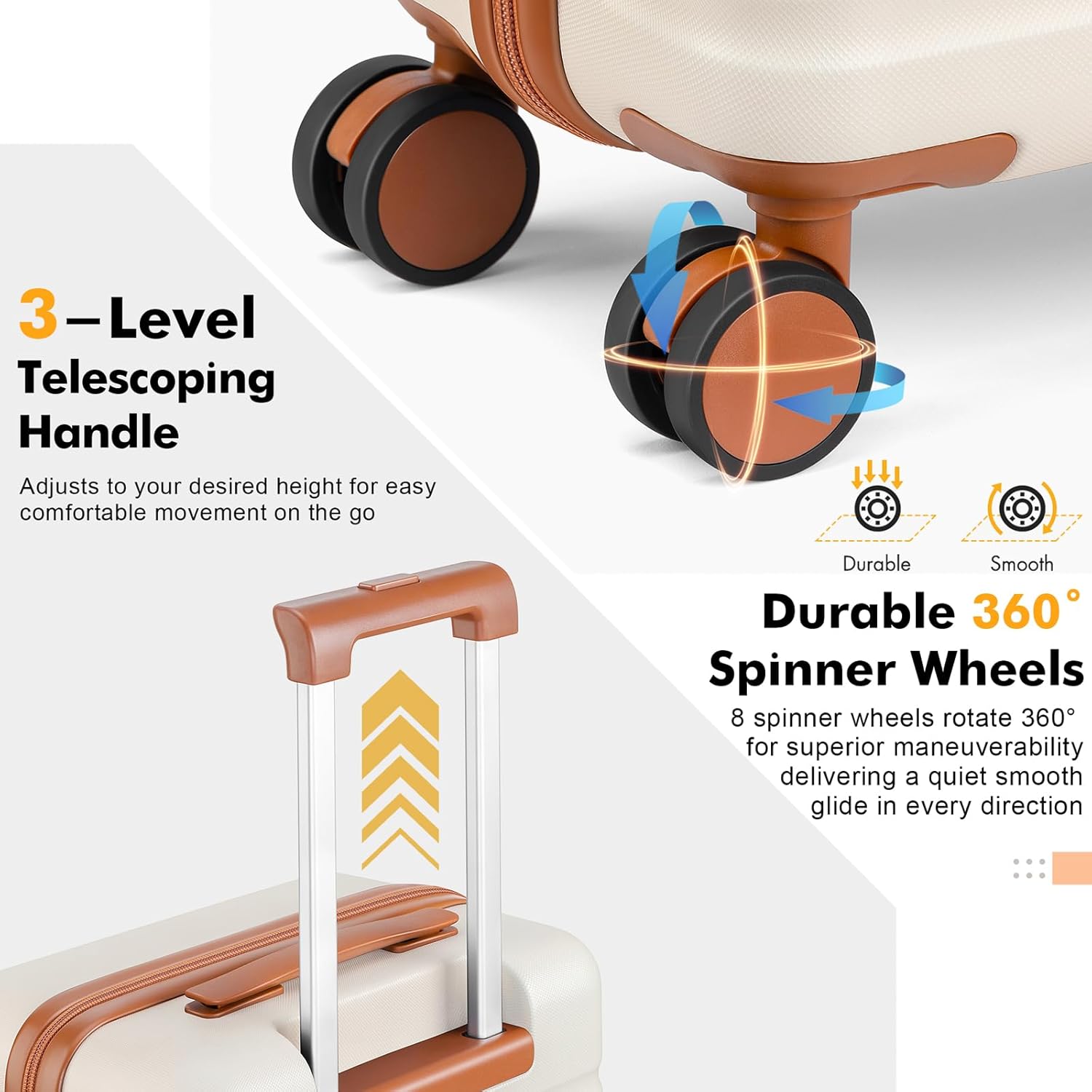 Luggage Sets 3 Piece with Spinner Wheels, Lightweight PC Hardside Suitcase with TSA Lock & YKK Zippers, 20 Inch Carry On Luggage with Travel Bag for Men and Women, Beige